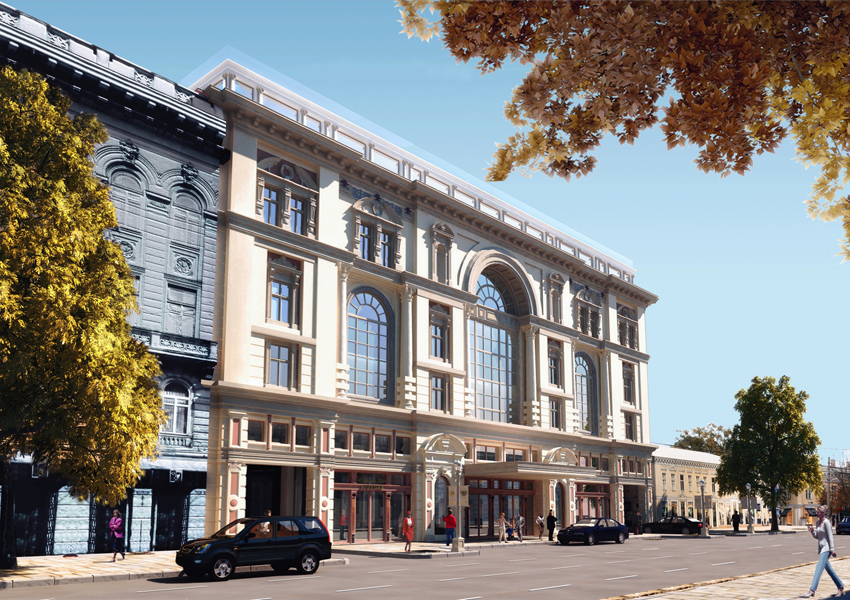 The front facade, that is visible from Ekaterininskaya Street, is solved using the architectural details and forms traditional for the historical center of the city and adjoining buildings. Plan of floors' usage: 1-4 floors – fashion stores with a total area of 7000 square meters; 5th floor – restaurants and entertainment complex for adults and children; 6-7th floor – hotel facilities with exquisite apartments, sports center and the highest level of service. Also, in this boutique hotel, there will be a concert hall with summer terraces, from where you can see a beautiful view of the sea bay and the historical center of Odessa.